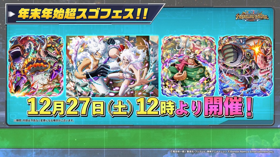 【トレクル】年末年始超スゴフェス 2025 更新日:2025年12月24日 公開日:2025年12月23日 【酒場】仲間探しイベント 年末年始超スゴフェス 運営からのお便り動画、本日20時より公開! 年末年始超スゴフェスの新キャラクター情報やキャンペーン情報を確認しましょう! ▼視聴予約はこちら youtu.be/cM6YwJ0Jkqk ▼昨年は、エー […] 続きを読む