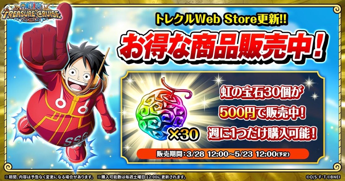 【トレクル】トレクル Web Store更新!大特価⁈ 公開日:2026年3月31日 イベント トレクル Web Storeが更新されました。 虹の宝石30個が500円! 期間中、毎週一度だけ購入でき、 購入可能数は毎週土曜日の12時に更新! 販売期間は、3/28(土)12:00~5/23(土)12:00(予定) […] 続きを読む